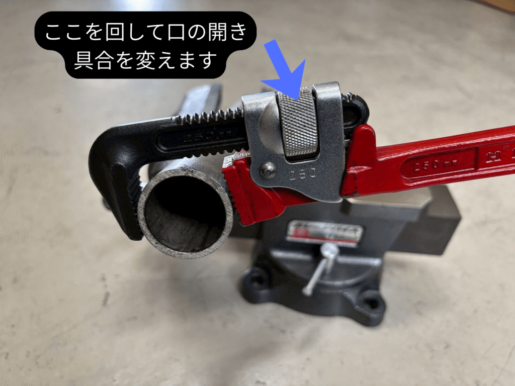 まず、掴みたいパイプの太さに合わせて、ウォームギアを回し、アゴの開きを調整します。