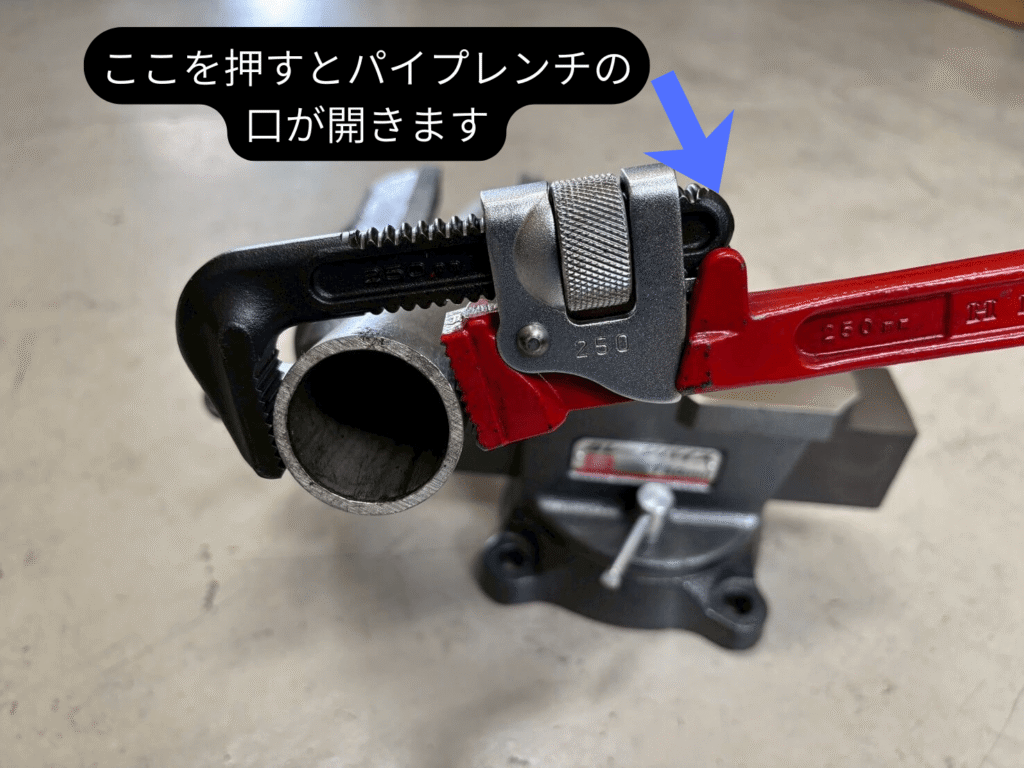 レンチをセットしたら、上アゴと下アゴをパイプに当てます。