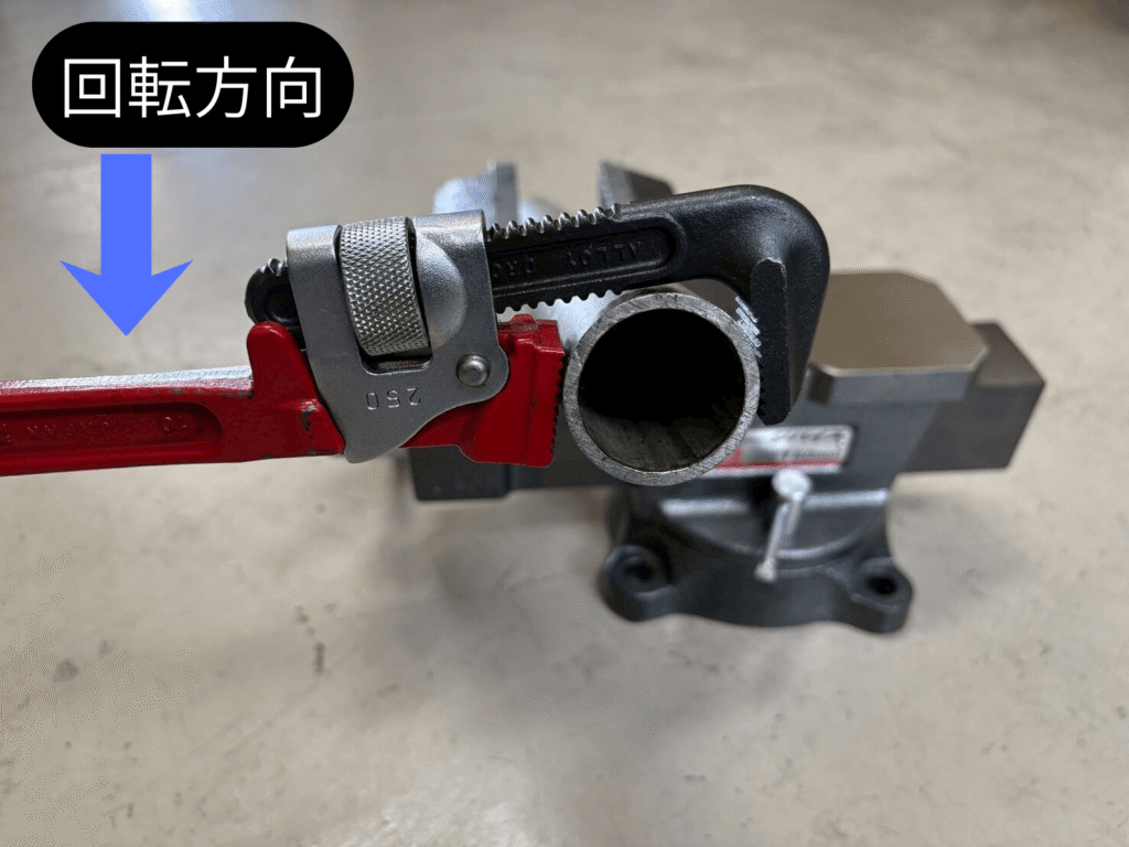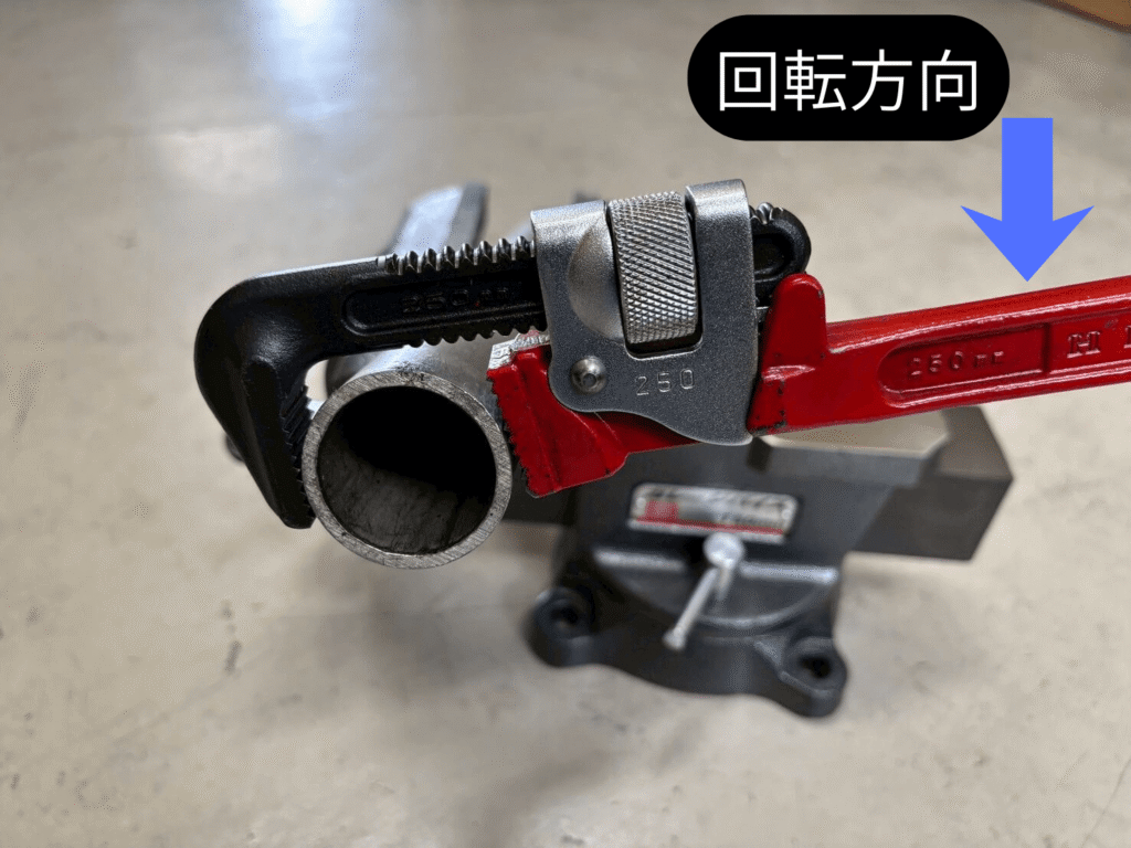 これが一番重要です。 パイプレンチは、一方向にしか力をかけられません。